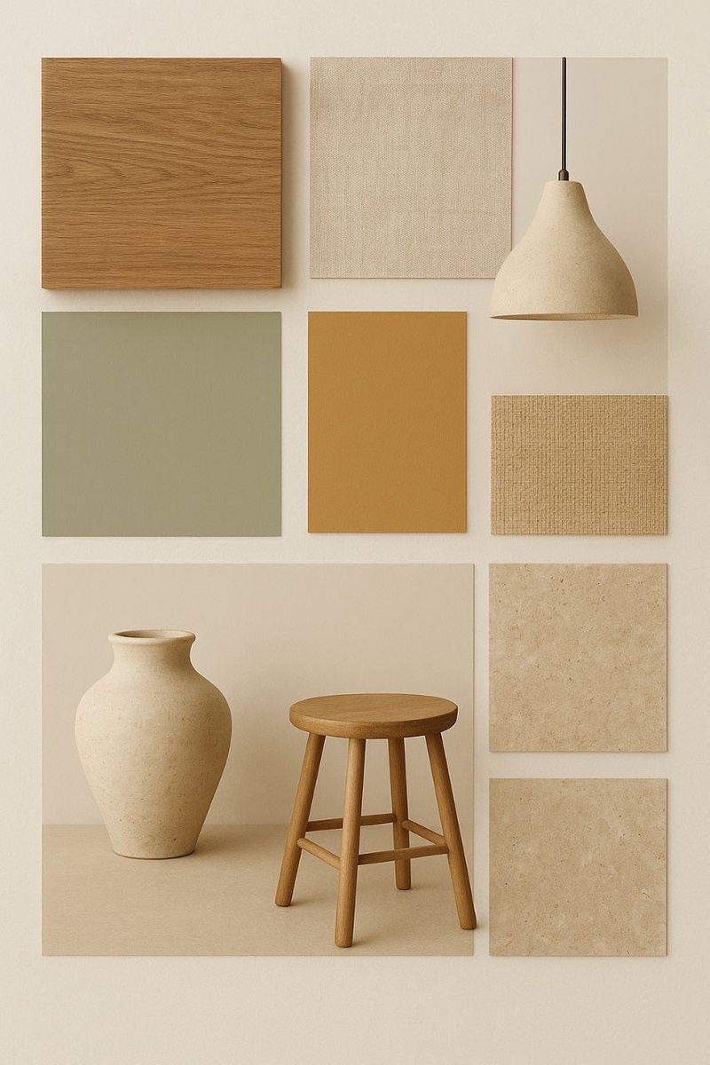 спокойную, естественную палитру — оттенки льна, глины, охры, дерева, серо-зелёные и тёплые серо-коричневые тона;