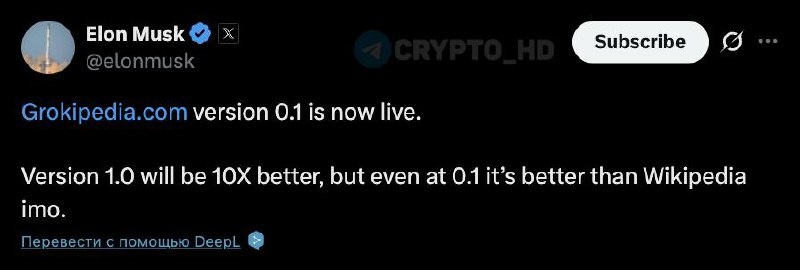 ✌️ Илон Маск запустил AI-энциклопедию Grokipedia (twitter) ➠ Полностью open-source – бесплатный доступ для всех. ➠ Пользователи могут предлагать изменения, но последнее слово за Grok. ➠ Уже 885,000+ статей. ➠ Маск утверждает, что цель – убрать идеологические перекосы и «пропаганду». Crypto Headlines