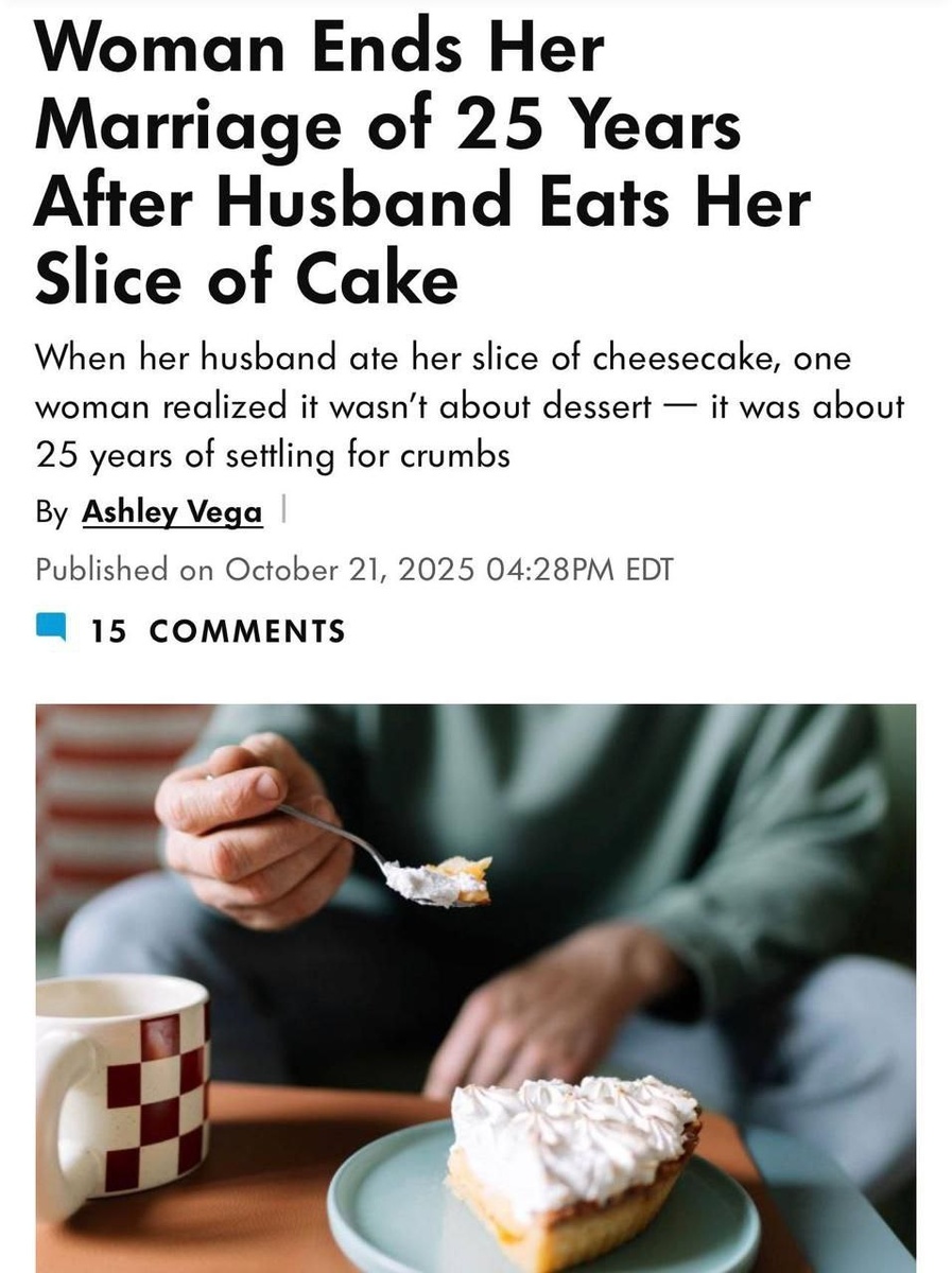 🧁 Женщина развелась после 25 лет брака. Из-за чизкейка. Романтический ужин в честь юбилея, два десерта на двоих. Она откладывает свой на утро — как принято у людей, верящих в завтра. Просыпается с предвкушением. Открывает холодильник. Пусто. Муж съел ночью. Не свой — тот он уничтожил сразу. А чужой, отложенный, обещанный себе на завтрак. Ганнибал переходил Альпы, чтобы удивить мир. Тут человек переходит к холодильнику — и разрушает четверть века. Казалось бы, мелочь. Но мелочь оказалась финальной: «Мне нужен тот, кто защитит от других, а не украдёт последнее».