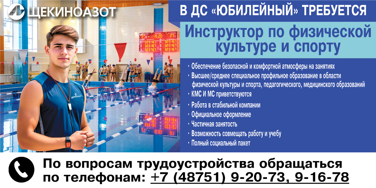 В Дом спорта «Юбилейный» компании «Щекиноазот» и АНО «Спортивное наследие» (поселок Первомайский) требуется инструктор по физической культуре и спорту. ✅ Обязанности: Обеспечение безопасной и комфортной атмосферы на занятиях (бассейн) ✅ Требования: Высшее / среднее специальное профильное образование в области физической культуры и спорта, педагогики, медицины (рассмотрим студентов) КМС И МС приветствуются ✅ Условия: Работа в стабильной компании Официальное оформление Частичная занятость (возможна подработка - на неполную ставку) Возможность совмещать работу и учебу Полный социальный пакет 📌 По вопросам трудоустройства просим обращаться по телефонам: +7 (48751) 9-20-73, 9-16-78.
