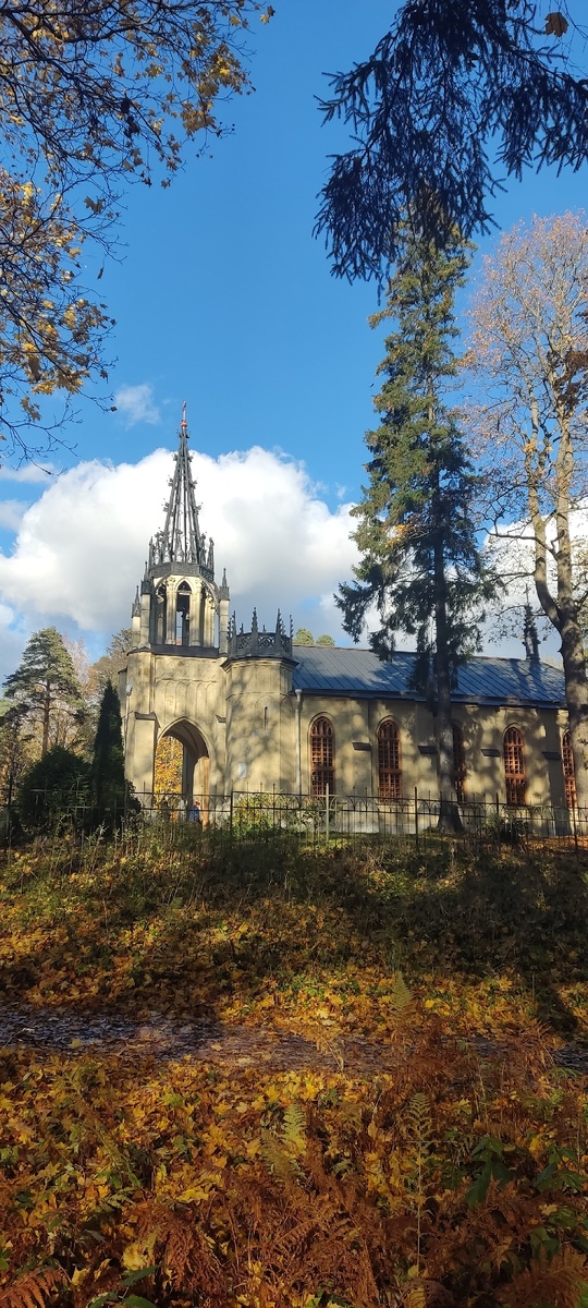 Осень в Шуваловском парке — это магия сама по себе: золотые аллеи, запах влажных листьев . И посреди всей этой красоты вдруг вырастает настоящее готическое чудо — Храм святых апостолов Петра и Павла.