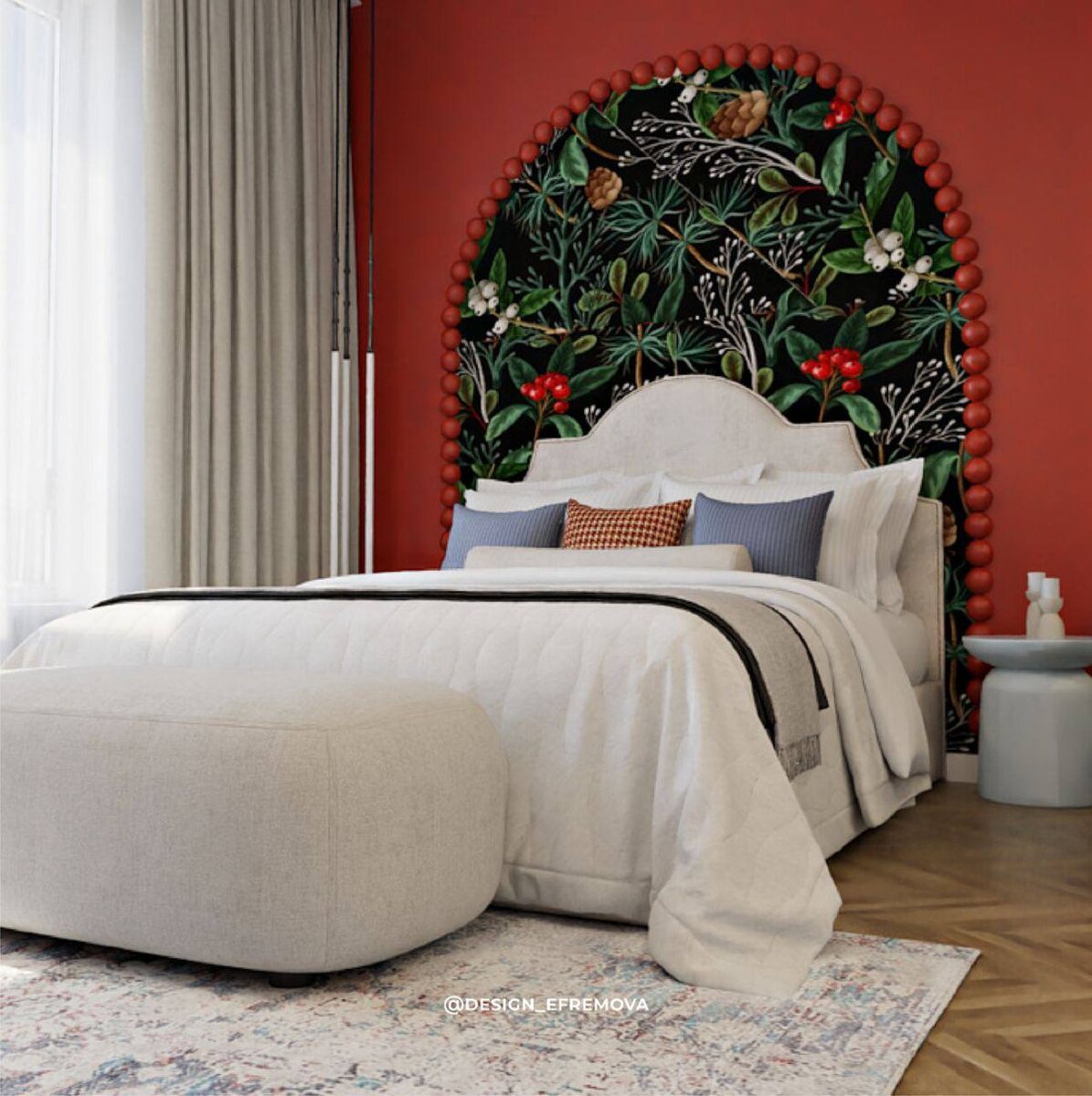 ❤️ Решила рассказать подробнее об этом решении, потому что внимание интерьер привлекает, а исполнение у него совсем несложное и недорогое ✨ Ранее я уже делала пост с артикулами и ссылками из сметы этого проекта. Расскажу об исполнении! На стенах краска Тикурилла колер по Ral 3000, такой русский красный )) А рисунок за кроватью — это фотообои, которые, кстати с озон, а обрамляет их полусферы окрашенные тем же цветом и приклеенными с помощью Титана к стене! Не на обои ) Полусферы бывает разные, у нас будут деревянные, но если хочется сэкономить, на маркетплейсах полно пенопластовых, но вблизи они себя выдают, конечно… Перегородка Алюмика, пока не нашла более выгодных поставщиков, цена и качество соответствуют друг другу) Надеюсь, мой мини гайд был полезным🙌🏻 если да, поделись лайком ❤️ Для связи @design_efremova #кейсы