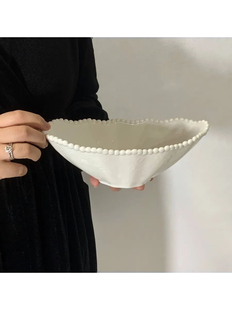 Эта глубокая тарелка сразу привлекает внимание изящным винтажным дизайном. Белая керамика с деликатными бусинами по краю напоминает посуду из французских бутиков. Размер 23 см идеален для сервировки салатов, пасты или десертов — достаточно просторно, но не громоздко.