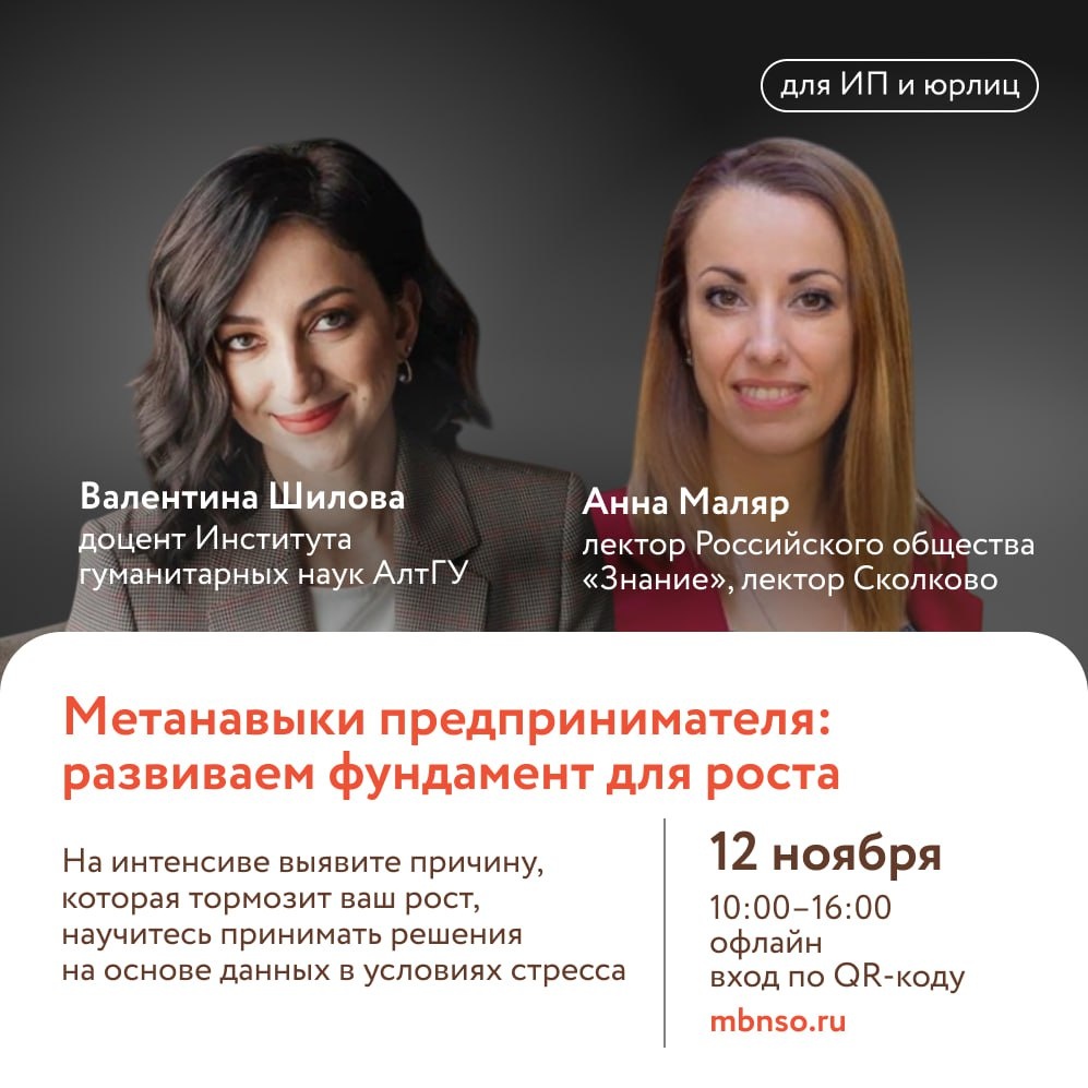Оттачиваем навыки настоящего лидера 12 и 14 ноября в центре «Мой бизнес» → 12 ноября (ср): тренинг для ИП и ООО «Метанавыки предпринимателя: развиваем фундамент для роста» → 14 ноября (ср): интенсив «Риторика лидера. Управляй страхом и эмоциями» ✈️@mbnso господдержка бизнеса ✅Связаться с нами написать: ВКонтакте, сайт позвонить: 8 800 600 34 07 #длявсех #ИПиООО