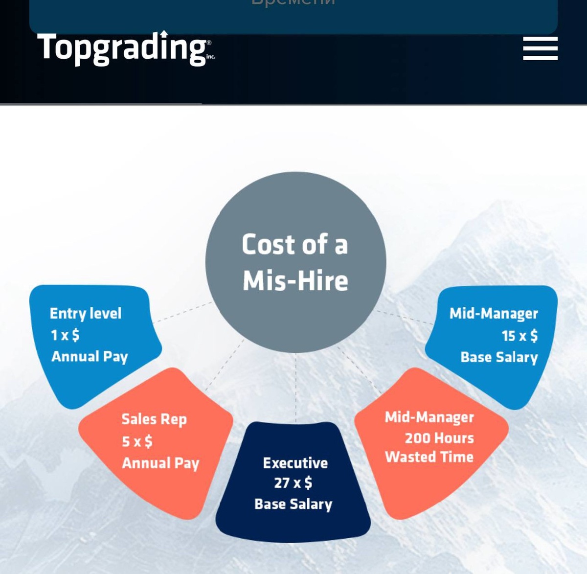 Компания 👆рекламирует снижение ошибок при найме. Интересна оценки диапазона потерь при найме СЕО (со ссылкой на Harvard Business Review): от 5 до 27 годовых окладов этого самого СЕО. И основные потери от такого неудачного найма — не от затрат на рекрутинг/зарплату неудачного/потраченное время команды, а от демотивации команды/упущенных возможностей. Очевидный вывод: нанимать ген.директора лучше с тестовым периодом на позиции -1.