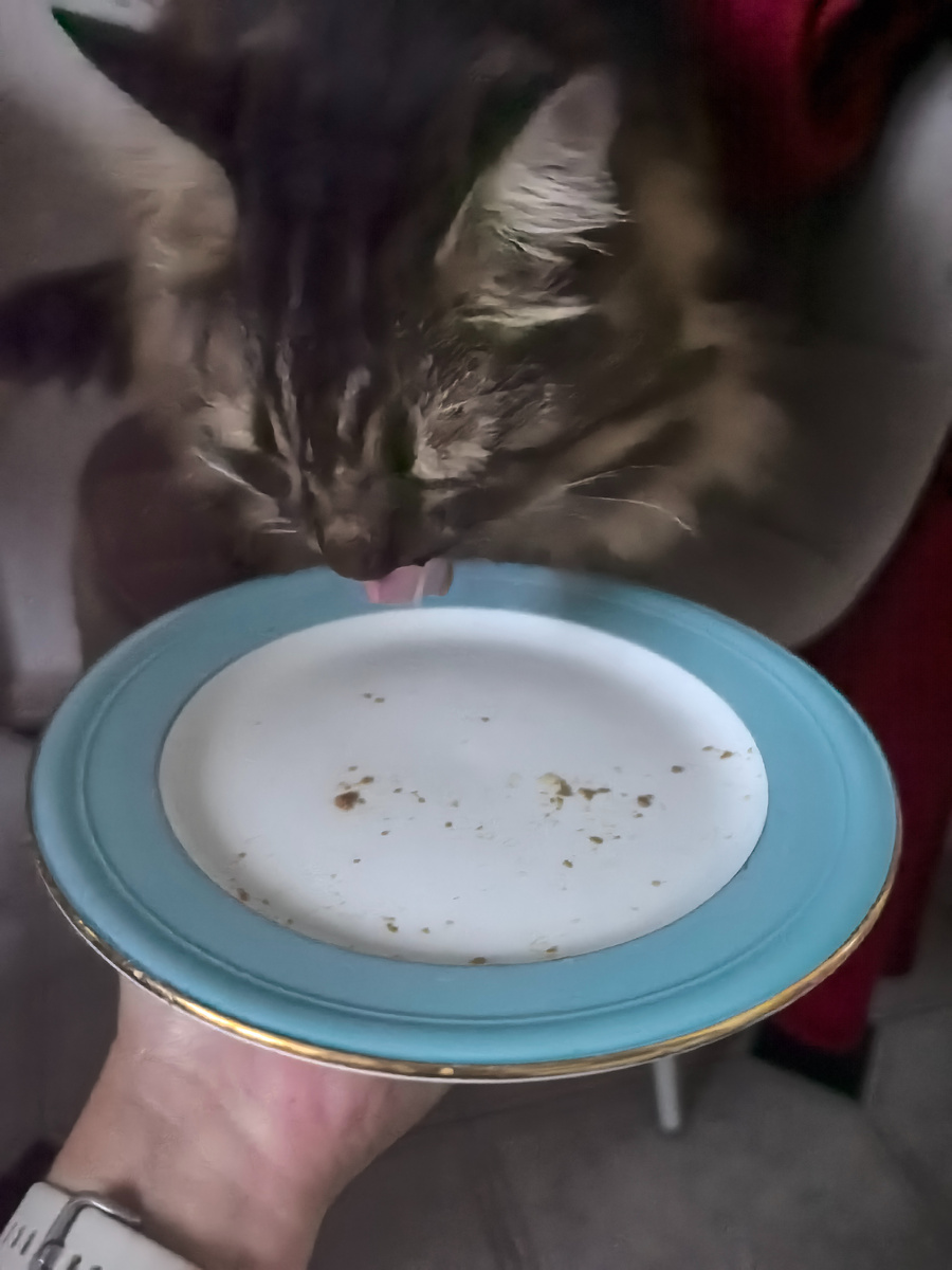 Хозяина покормили, и про меня не забыли. Положила мне хозяйка паштет на царскую тарелку. Стала ставить на пол, а я сидел на стуле и не вставал. Тогда хозяйка поднесла паштетик поближе, чтобы я понюхал. А это был мой хитрый план. Я не просто понюхал, а стал есть. В итоге получилось, что будто с ручки кушал.