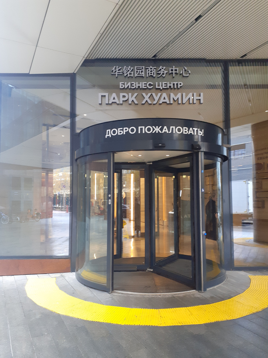Замерзнув и промокнув на прогулке по парку "Хуаминюань", мы с подругой пошли отобедать в китайскую столовую бизнес-центра "Парк Хуамин". Он находится за гостиницей, вход выглядит так: