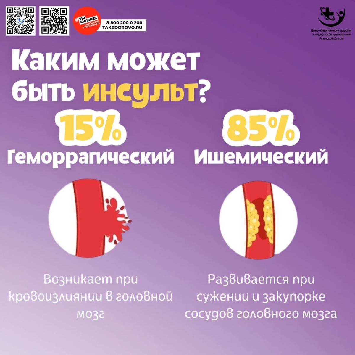 С 27 октября по 2 ноября — Неделя борьбы с инсультом! 🧠 Каким может быть инсульт? ✅ Ишемический (80-85% случаев) — Сосуд закупоривается тромбом — Кровь не поступает к участку мозга — Развивается постепенно ✅ Геморрагический (10-15%) — Сосуд разрывается — Кровь изливается в мозг — Чаще возникает при высоком давлении ✅ Транзиторная ишемическая атака (ТИА) — «Мини-инсульт» — Симптомы проходят за 24 часа — Требует срочного обследования! Важно: Любой тип инсульта требует немедленной помощи! Время = мозг. ⏰ #НеделяБорьбыСИнсультом #ТипыИнсульта #ИшемическийИнсульт #здоровоебудущее #ЗдоровоеБудущее62 #ЗдороваяРязань