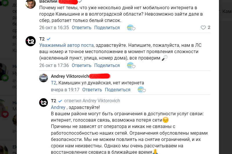 «T2. Здравствуйте, Андрей Викторович! В вашем районе могут быть ограничения в доступности услуг связи: интернет, голосовая связь, возможна потеря сети. Причины не зависят от оператора и никак не связаны с работоспособностью наших сетей. Ограничения обусловлены мерами безопасн