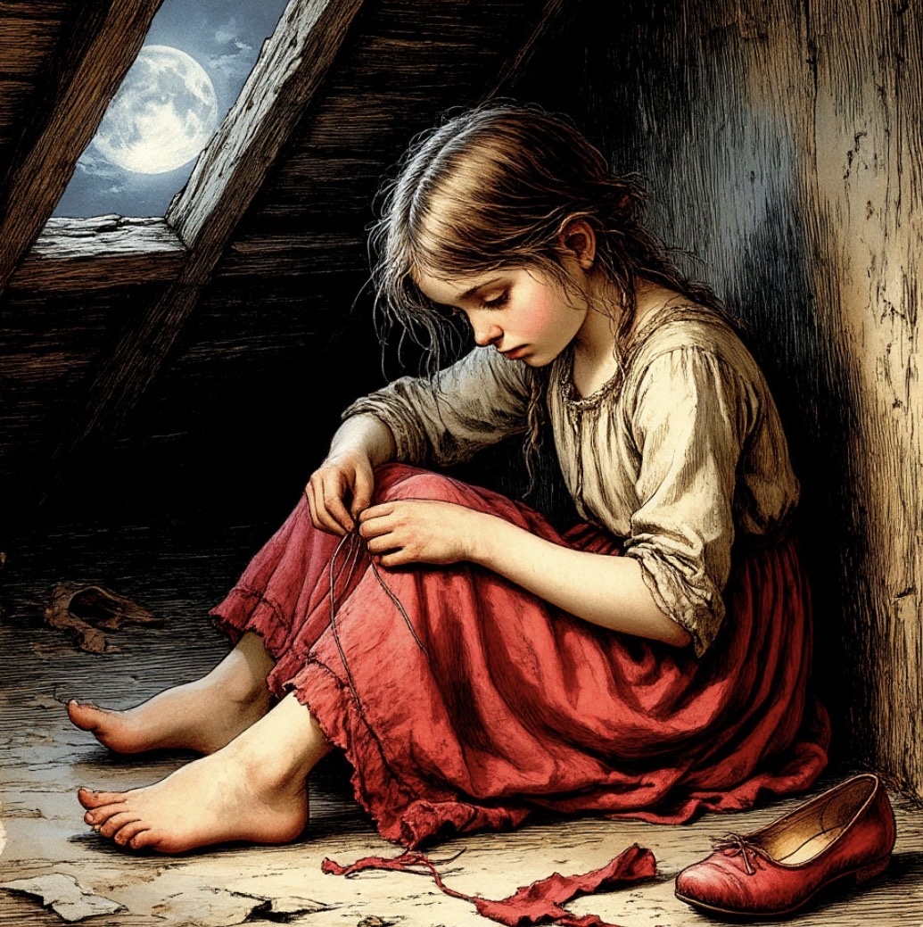 Сказка начинается с образа девочки-сироты, лишенной обуви. Это психика в состоянии первоначальной нужды — «босоногости». Она движется по жизни автоматически, «не глядя ни вправо, ни влево», что символизирует глубокое отчуждение от инстинктов и творческого потенциала. Она существует в режиме выживания, на «рельсах социально одобряемых» паттернов, лишенная собственной опоры и воли.