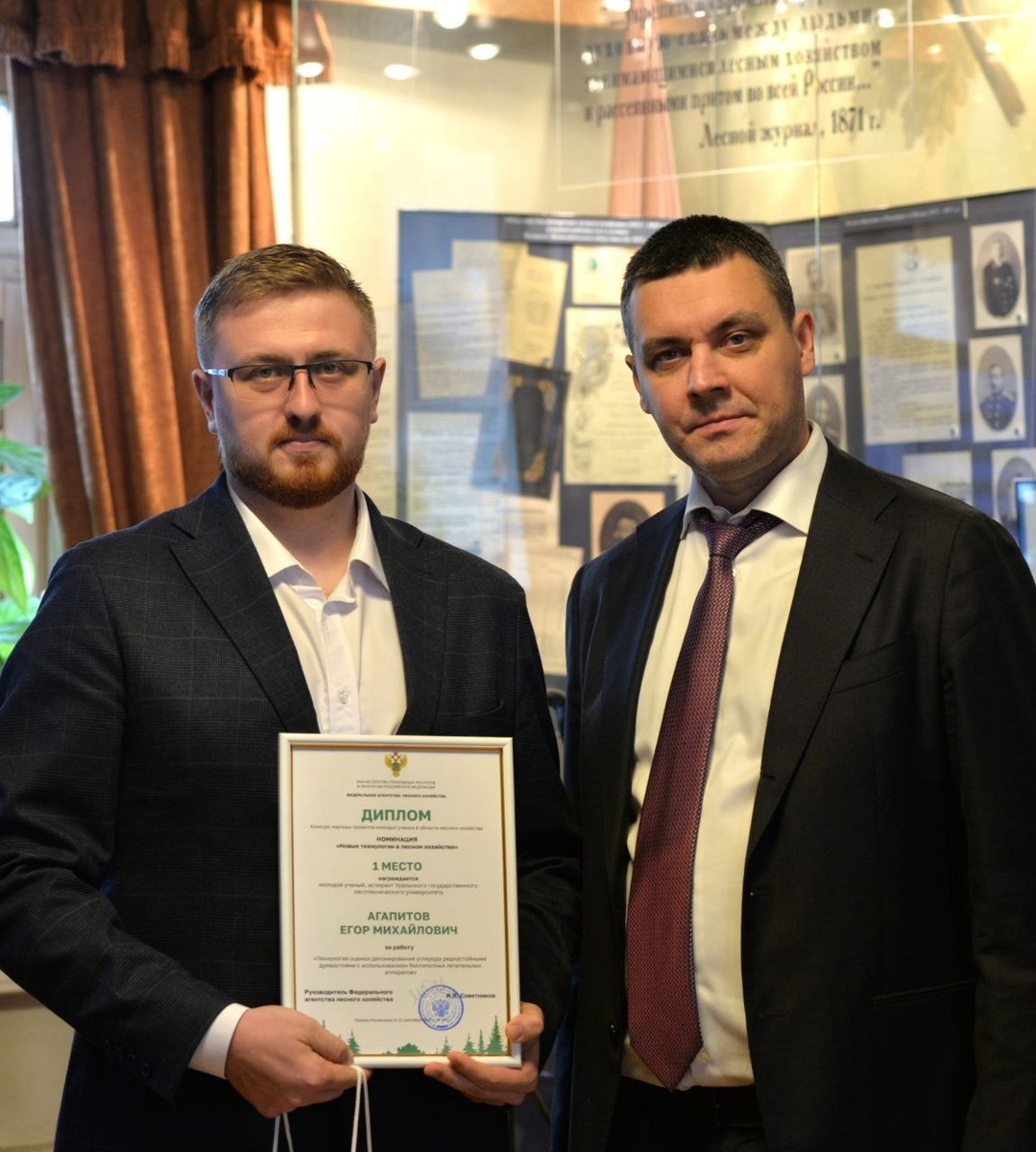 В Российском музее леса прошла церемония награждения победителей ежегодного Конкурса научных проектов молодых ученых, который проводит Рослесхоз. 🏆На церемонию награждения был приглашен ассистент кафедры экологии и природопользования УГЛТУ Агапитов Егор Михайлович. Его работа «Технология оценки депонирования углерода редкостойными древостоями с использованием беспилотных летательных аппаратов» заняла 1 место в номинации «Новые технологии в лесном хозяйстве".