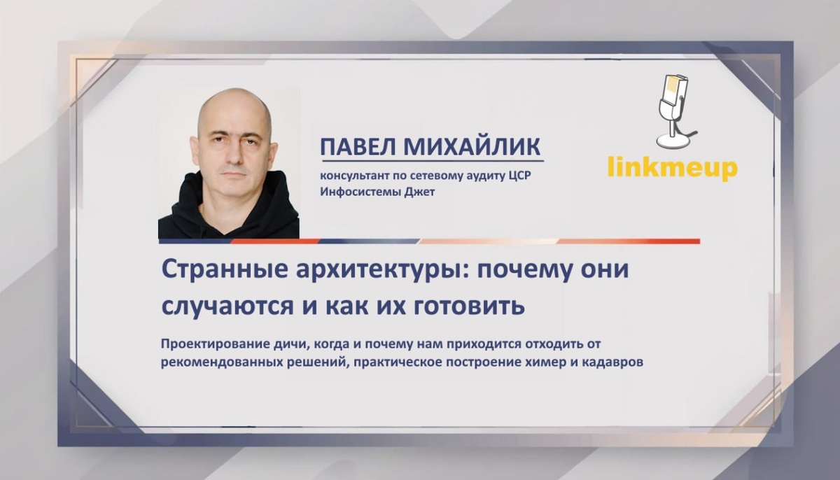 Новый день - новый доклад для линкимитапа в Новосибирске! Павел Михайлик, отлично известный всем нам спикер, представит нам своё видение ситуации, когда ты очень здорово знаешь все рекомендации по дизайну сетей от всех серьёзных вендоров, но наступил тот самый момент и тебе предстоит своим же руками построить странное. Натурального кадавра! Но так, чтобы он работал и был обслуживаемым. Шикарнейшие истории из первых рук, как обычно - пятого февраля в Новосибирске на https://linkmeetup.ru/ Билеты на сайте. И да, свой доклад ещё можно подать. Сейчас самый разгар отбора ;)