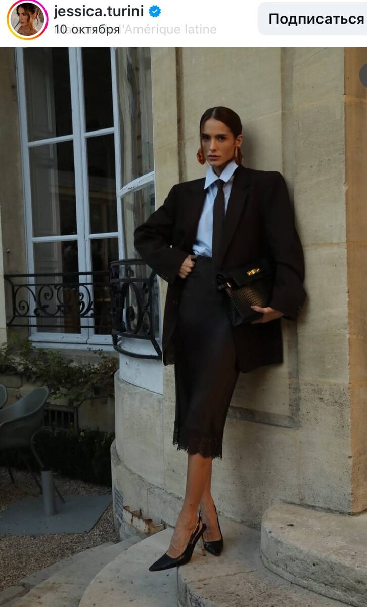 Понравился образ от jessica.turini идеальный баланс элегантности и женственности 🤎🩵🖤 Этот образ — готовый ответ на вопрос, что надеть в офис или на нетворкинг. Вроде все понятно, жакет+рубашка+галстук+строгая обувь и сумка. А изюминка образа-строгая юбка-карандаш, но она из шелка и украшена кружевом! Это добавляет мягкости,романтики, которая отличает этот образ от просто формального. И конечно, невозможно не влюбиться в цветовую гамму. Сочетание глубокого шоколадного и насыщенного голубого. Смотрится свежо, небанально и невероятно гармонично. #идеяобраза