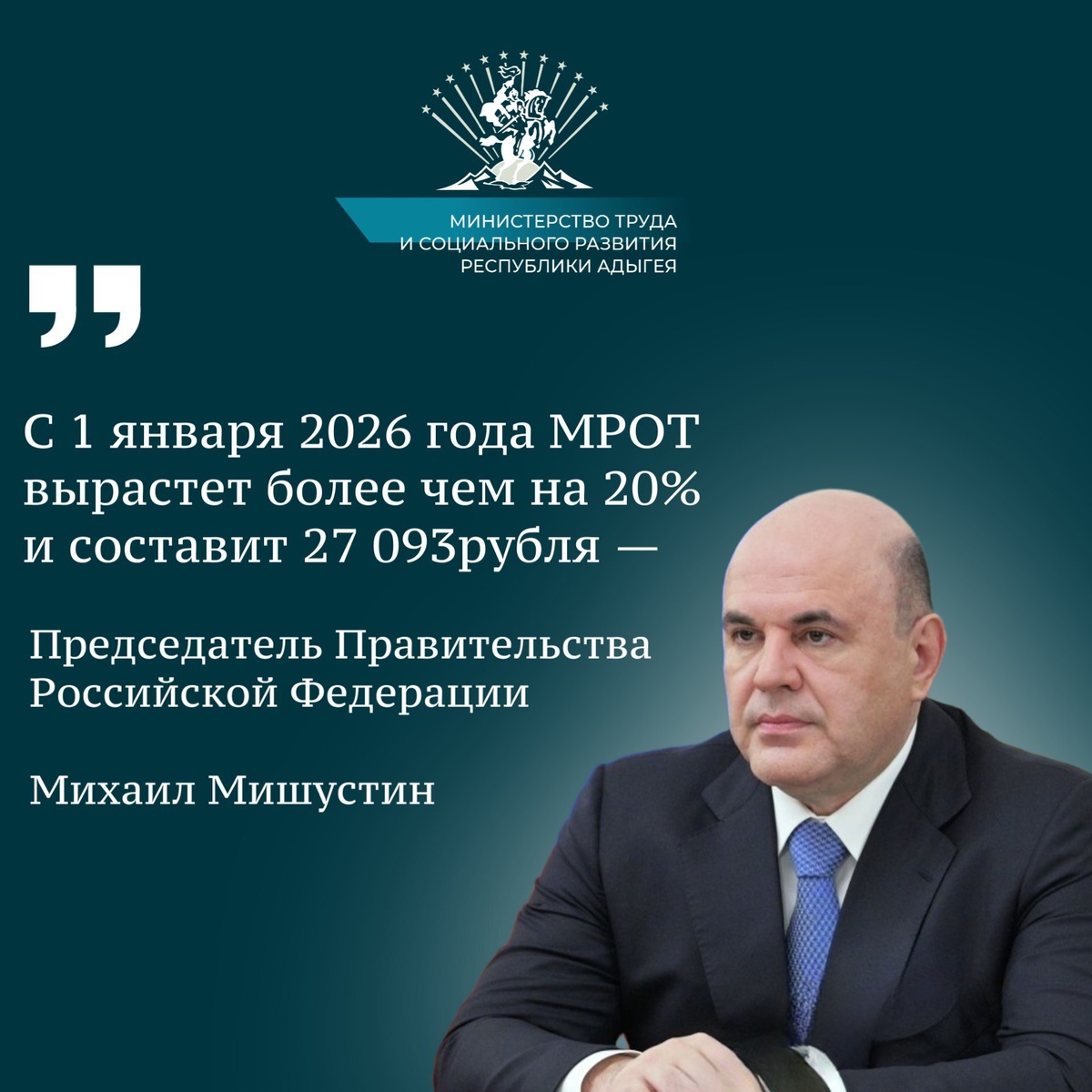 С 1 января минимальный размер оплаты труда вырастет более чем на 20% 💼 Правительство подготовило корректировки в законодательство о повышении минимального размера оплаты труда – он вырастет более чем на 20%. ⚡️ С 1 января 2026 года МРОТ составит 27 тыс. 93 рубля. Решение будет способствовать увеличению заработных плат для 4,5 млн человек. Также показатель МРОТ необходим для расчета многих других выплат, в том числе отпускных, больничных и пособий. «Президент подчеркивал, что МРОТ уже превышает прожиточный минимум. И такая индексация будет продолжена. Вопросы роста доходов людей постоянно находятся в центре внимания Правительства» , – отметил Михаил Мишустин. ➡️ Подписаться в MAX #минтрудинформирует