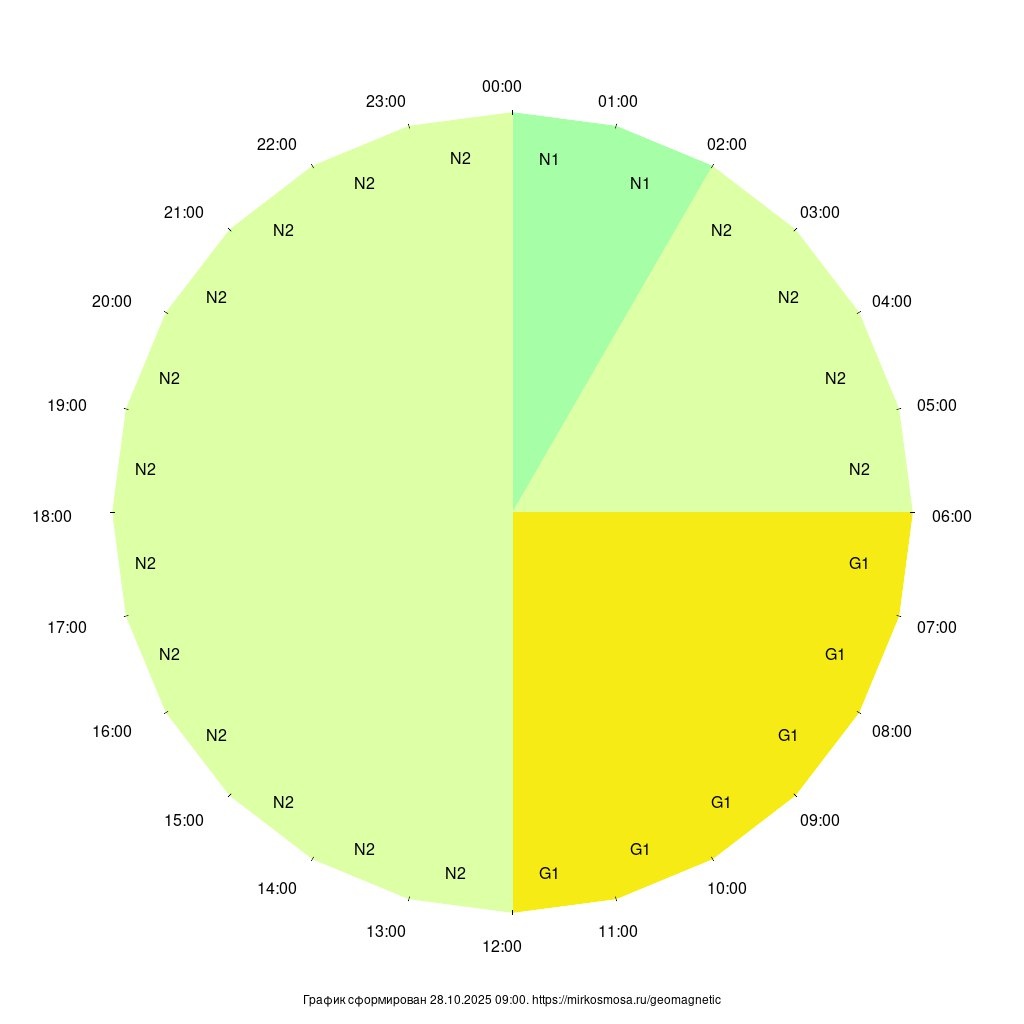 Геомагнитный прогноз на 28.10.2025: ожидается, что с 09:00 до 12:00 будет геомагнитная буря класса G1 (Незначительная, Kp=5), с 12:00 до