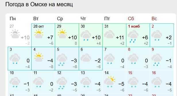 В Омске на следующей неделе ожидаются первые признаки наступления зимы. На этой неделе синоптики прогнозируют практически летнюю погоду с температурой воздуха до +15 градусов. Картина дня резко изменится с воскресенья, 2 ноября. В регионе похолодает до +2 градусов в дневные часы. В дальнейшем температура начнёт опускаться. Согласно долгосрочному прогнозу погоды на сайте Gismeteo, выше нуля температура уже не поднимется. По ночам будет до -8 градусов. По прогнозам синоптиков, 5–6 ноября в Омской области повсеместно ожидается мощный снегопад. С 12 ноября осадки в виде снега будут идти уже практически каждый день. Зима начнёт вступать в свои права. Читайте также на портале Om1.ru Опубликован прогноз погоды на начало ноября в Омской области