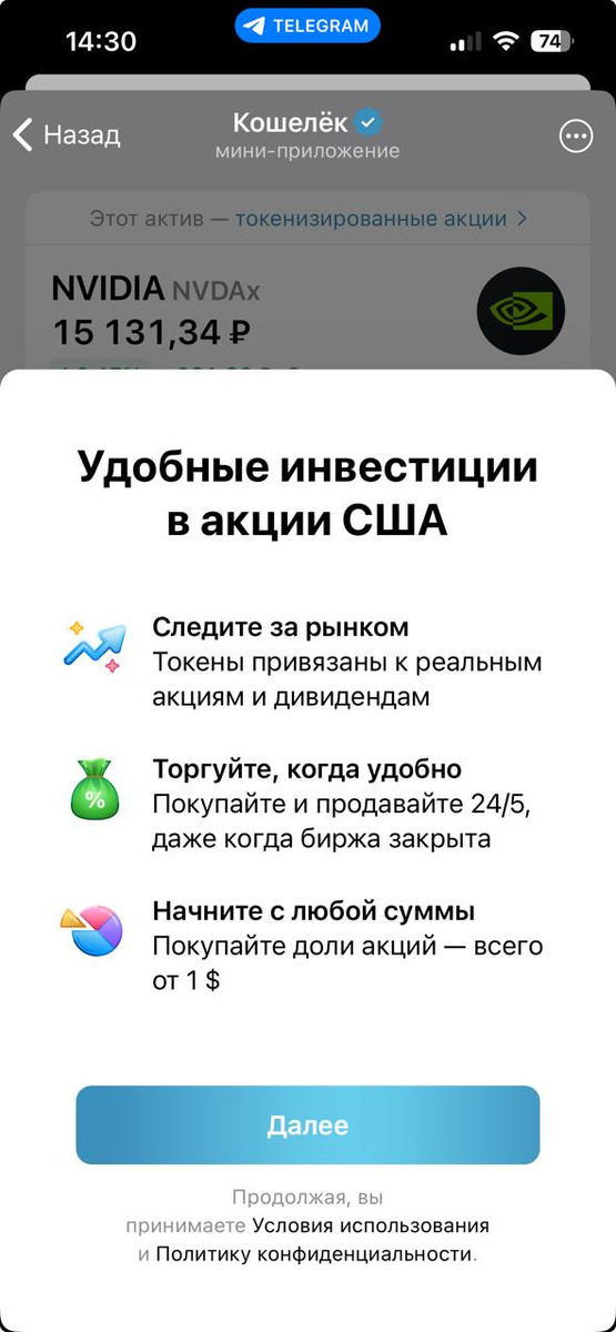 В «Кошельке» Telegram появилась возможность торговать токенизированными акциями и фондами. Можно купить долю от любой акции, цена — от $1. Торговля круглосуточная с понедельника по пятницу.