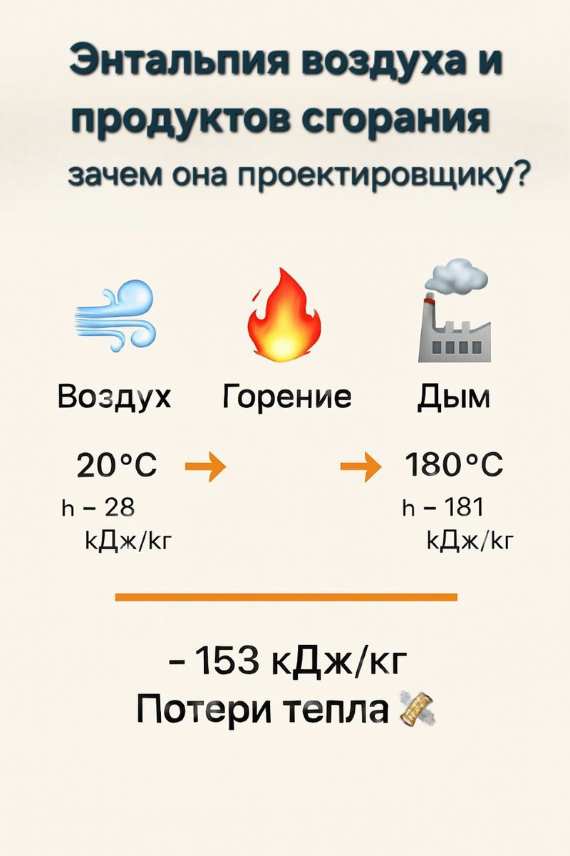 💡 Пример: воздух на входе 20 °C 🌬, газы на выходе 180 °C 🌪 → разница в энтальпии = ваши потери тепла, которые 💸 улетают в небо.