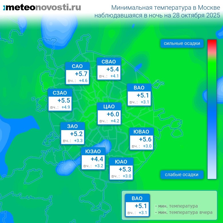#за12часов #ночь Прошедшая ночь на 28 октября была на 1.7°C теплее предыдущей. Минимальная температура ночью в Москве оказалась на 4.2°C выше нормы, что немного теплее, чем обычно. Самая низкая температура +4.4°C была зафиксирована в 7 часов на юго-западе города, а теплее всего было на западе: +6.7°C. Разница по минимальной температуре в разных частях столицы составила за минувшую ночь 2.3°C. Максимальные порывы ветра ночью достигали 6 м/с. Атмосферное давление за ночь понизилось с 739 до 735 мм.рт.ст. Повсеместно прошли осадки. Больше всего осадков выпало на юго-западе города – 8.8 мм. Самая холодная ночь в Москве 28 октября наблюдалась в 1912 году, когда минимальная температура составила -15.7°C, а самая теплая в 2013 году с температурой +10.5°C. Перейти на сайт Прогноз погоды на 14 дней