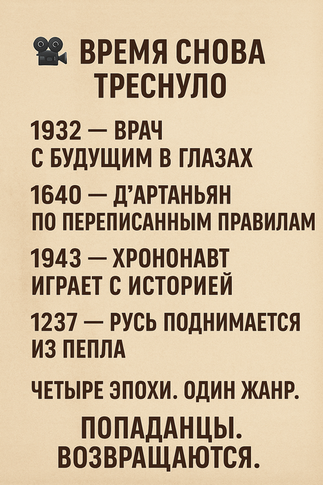 Один варит пенициллин в студенческом подвале, другой фехтует, забыв перезарядить мушкет, третий рушит высадку в Нормандии, а четвёртый бьётся под снегом за Русь.