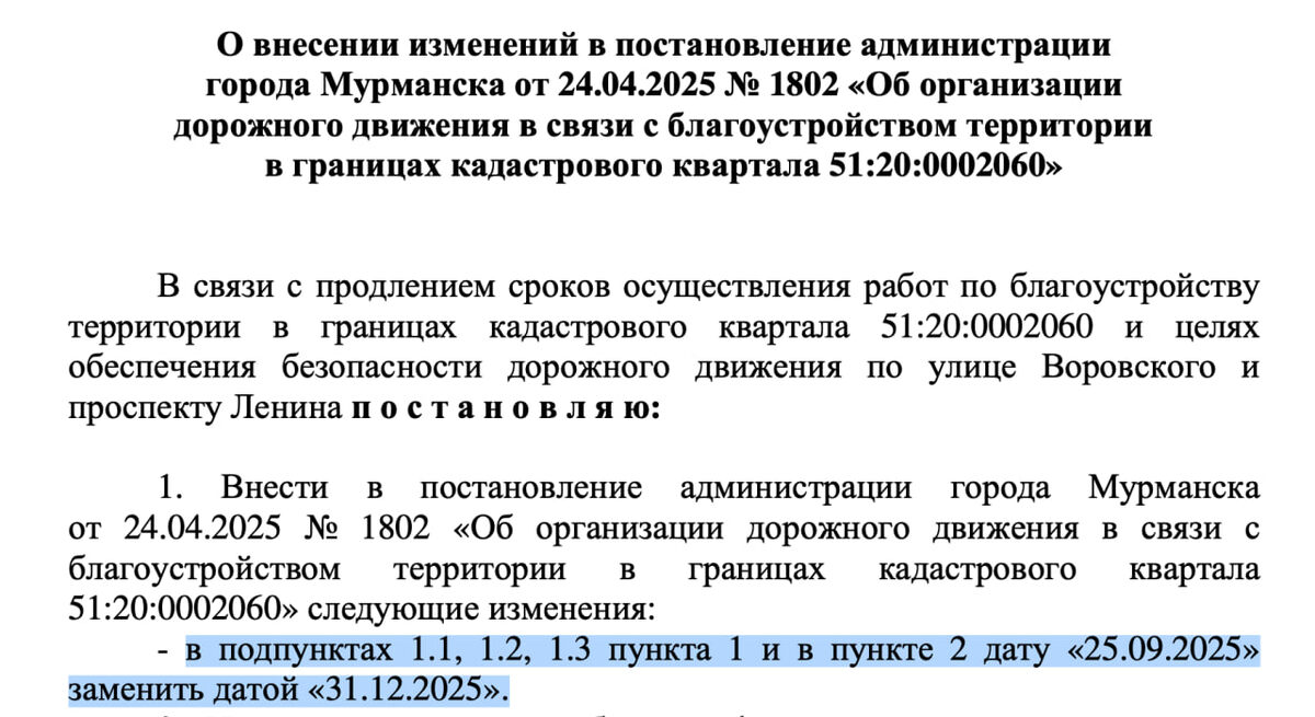 Администрация города Мурманска продлила ограничения движения по проспекту Ленина и улице Воровского до 31 декабря 2025 года в связи с продлением сроков осуществления работ по благоустройству территории <...> и целях обеспечения безопасности дорожного движения. Согласно первоначальным планам, ограничение движения в районе площади Пяти Углов должно было закончится ещё 25 сентября. Напомню, бóльшая часть реконструируемых и благоустраиваемых в центре Мурманска объектов должно быть готово к середине декабря. ❄ «Арктический Обозреватель»