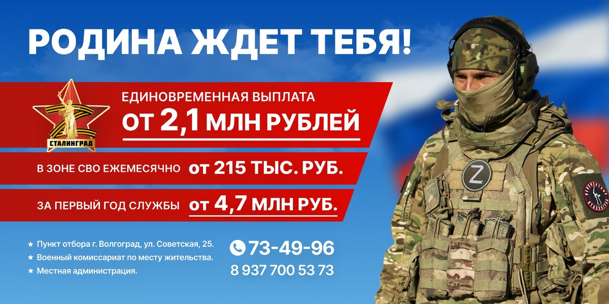Правильный выбор — какой он? Тысячи волгоградцев уже определились 💯 Служба в армии — это не только шанс прокачать свои навыки, но и возможность хорошо заработать, получить уникальный опыт, обрести верных друзей и внести вклад в развитие России. Если тебе исполнилось 18 лет, ты горишь желанием показать себя и нет противопоказаний по здоровью, обратись в администрацию, военкомат или приходи по адресу: г. Волгоград, ул. Советская, 25. Сразу после подписания контракта ты получишь 2,1 млн рублей, а ежемесячное вознаграждение в зоне СВО — еще от 215 тысяч рублей. Узнай больше на сайте службапоконтракту.рф или по номеру 117 🤝