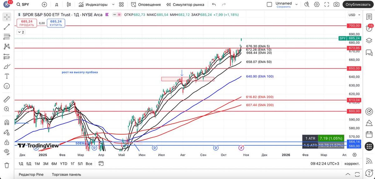 ВЫВОД : происходит самый сильный «бычий» моментум ГЭПы ускорения на дневном графике. Рост также обусловлен за счет техов $QQQ и $SMH полупроводников = после такого сильного моментума, не удивимся если рынок возьмет паузу. А тем временем продолжаем видеть слабость $RSP и $RUT = которые со временем должны поддержать рынок. Продолжаем последовательно нагружать портфель, рынок как выглядел безупречно, так и выглядит #spy #технический_анализ #америка #трейдинг_сша #фондовый_рынок #обзор #вывод #qqq #vix #smh #mags #xlk #ixic