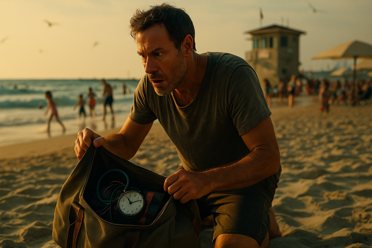 Он садится рядом с дорогой сумкой — жест уверенной, спокойной руки. Не глядя, отщёлкивает молнию, находит полотенце, очки, на ощупь тянется к кошельку. Но под пальцами — не кожа и не ткань. Под пальцами — жёсткий металл, влажный от соли. Ещё глубже — коробка. Из неё торчит короткий шланг, как язык. И под ладонью — холодный, как утренний ветер, часовой механизм.