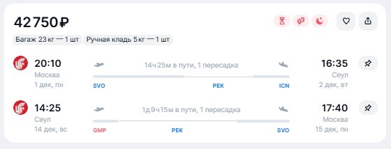 ✈️Москва - Сеул (Южная Корея), туда и обратно с пересадками в Пекине, с багажом, за 42750 рублей