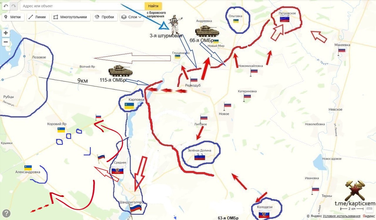 В ответ на пост Изюмское направление Очень перспективное для нас и смертельно опасное для Харьковской ОПГ противника. Сейчас они "Объединенные силы" с новым командующим. Наступление на Коровий Яр. ВС РФ уперлись в опорники на гребне. Он включен в систему еще нескольких укреплений на окраинах села и вдоль трассы на Карповку. ВС РФ предприняли два обходных маневра. Первый по соседнему гребню и перерезали дорогу. А вторым ударом заблокировали Александровку и наша разведка вошла в лесной массив. схемы и карты