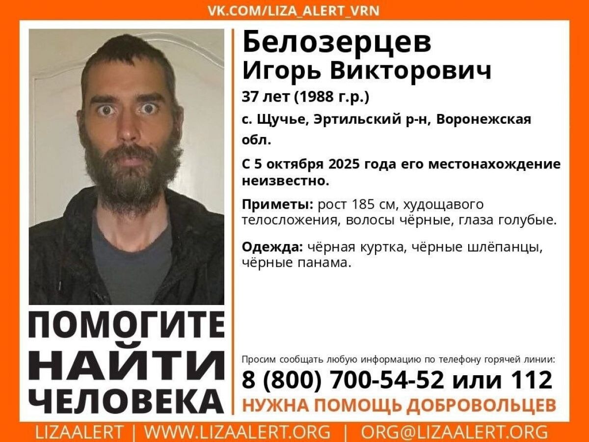 Воронежские волонтеры разыскивают мужчину, который пропал в начале октября, и с тех пор его не может найти полиция. Об этом сообщают представители поискового отряда «Лиза Алерт». 5 октября на номер 112 обратился Игорь Белозерцев, который сообщил, что потерялся в болоте. Мужчина описал свой маршрут и вероятное местонахождение, однако сотрудникам полиции не удалось своими силами найти пропавшего, и 22 октября они обратились к волонтерам. Был организован поисковый штаб, который начал свою работу 26 октября. В поисках принимали участие 22 добровольца и сотрудники полиции, разбитые на 10 пеших групп. Поисковиками было пройдено более 60 километров. Поиски велись вдоль рек Матреночка и Битюг рядом с селами Александровка и Старый Эртиль. К сожалению, без вести пропавшего мужчину найти не удалось, поиски были осложнены тем, что проходили в заболоченной труднопроходимой местности. Однако работа штаба не прекращалась, и волонтеры продолжают поиски и просят всех, кто владеет какой-либо информацией