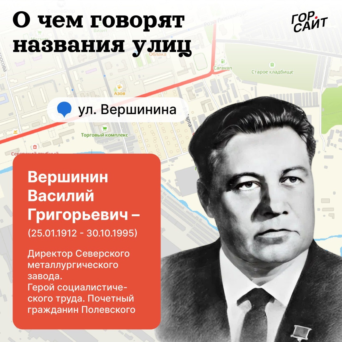 Вершинин Василий Григорьевич-(25.01.1912 - 30.10.1995) Директор Северского металлургического завода. Герой социалистического труда. Почетный гражданин Полевского.