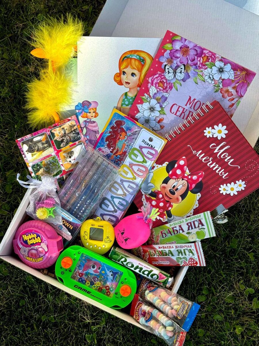 Внутри наборов от проекта «Флешбэк» — вещи, связанные с атмосферой девяностых и нулевых: тетради с обложками из 2007, ручка 8 в 1, фломастеры-далматинцы, печати-штампы, закладки с блестками, тамагочи, блокнотик с замочком и ключиком. Содержание собирается вручную и не повторяется от набора к набору.