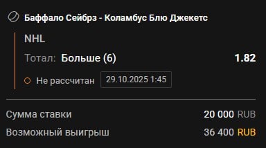 🏒🏒🏒🏒🏒 🐃Баффало - 🔵Коламбус Встреча двух самых результативных команд прошлого сезона (матчи с их участием, Баффало 6.6 шайб за игру, Коламбус 6.4 шайбы), с тех пор ничего не поменялось, команды так же ставят на атакующий хоккей, потому что в обороне дыра и вратари не выручают. Баффало объективно самая весёлая команда лиги, дают играть всем командам и сами не прочь зарубиться. В общем, верх здесь напрашивается. Прогноз: Тотал больше 6