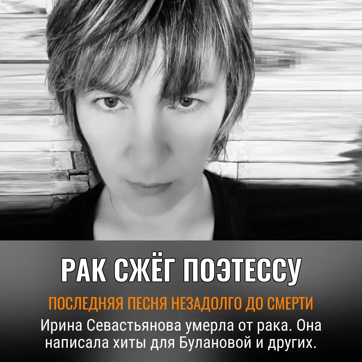 В 46 лет сгорела от рака поэтесса Ирина Севастьянова — автор хитов Булановой и прочих знаменитостей. Жизнь у неё была не сахар: от бесконечных «стихов в стол» до сотрудничества с артистами, которым лирика была находкой. Последние дни она выкладывала новые песни, а через сутки уже была оффлайн — жизнь закрутилась быстрее, чем дорожка на виниле. Родные до сих пор в шоке: пару дней назад переписывались, а сегодня — похороны. Ирония судьбы: стих «Прощаю» оказался её личным прощанием. Наследие – пачка хитов, которые звучат, словно голос из параллельной реальности., Следите за новостями 📩