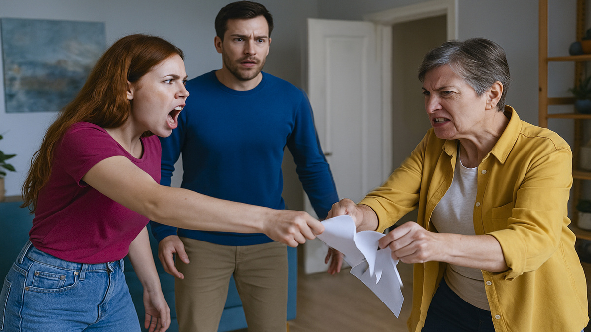 Галина Петровна шагнула вперед и вырвала бумаги из рук невестки силой. Оксана попыталась удержать документы, но свекровь дернула резче. Листы выскользнули из пальцев жены.