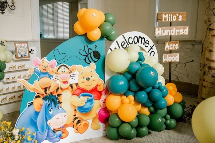 Приглашаем вас окунуться в самую настоящую сказку из детства! Для Майло оформили волшебный праздник в стиле Винни Пуха, украсив всё диснеевскими иллюстрациями, воздушными шарами и тематическими мелочами. На входе всех встречала небольшая фотозона с пышной гирляндой шаров и с картинкой с героями мультика. Отдельно оформили зону с фотками именинника в разном возрасте: это были фото из разных путешествий малыша. Даже надувной замок украсили шарами и, конечно, Тигрой, ведь он очень любил прыгать! Рядом с батутом накрыли длинный стол для всей детворы, под которым постелили травяную дорожку. Создавалось ощущение, что праздник проходил на лесной опушке. На столе было много декора жёлтого цвета, который поднимал настроение! Посмотрите, какое всё солнечное. Для каждого малыша поставили корзинку с подарками: на клетчатой салфетке были сладости. Для зоны сладкого стола тоже сделали красивый фон с цитатами из книги и изображениями героев. Здесь было так много красивый тематических закусок! Макарон