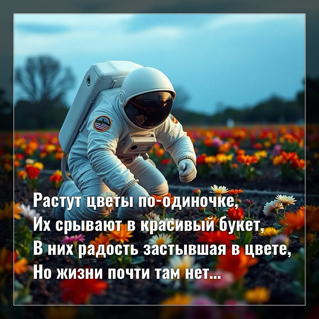Растут цветы по-одиночке, Их срывают в красивый букет, В них радость застывшая в цвете, Но жизни почти там нет, Не смогут расти здесь дольше, Чем сладкой воды напьются, А кто-то забудет про них, Цветы в края вазы уткнутся, И тихо начнут увядать, Красоту оставляя на фото, А могли бы расти в земле И радовать там кого-то, А может и есть в этом смысл, Счастливым быть здесь и сейчас, Наслаждаться мгновением кратким, Рядом ходит ведь смерть каждый раз, Но не каждый ей нужен сегодня, Кто-то будет цвести много лет, Пока «кто-то» не позовёт Его наконец на тот свет…