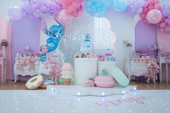 Американские декораторы создали настоящий шедевр, превратив обычный день рождения в волшебное путешествие на тропический остров. Вдохновением для оформления послужил всеми любимый мультфильм «Лило и Стич», и результат превзошёл все ожидания. Сиренево-розовые тона стали основой декора, создавая нежную и романтичную атмосферу. Перламутровые детали добавляли оформлению особый шарм и изысканность, делая каждый элемент по-настоящему волшебным. Воздушные шары и тропические цветы заполнили пространство, создавая иллюзию настоящего тропического острова. Гости словно перенеслись в мир мультфильма, где каждый уголок напоминал о приключениях любимых героев. Кондитеры очень постарались, создавая невероятные десерты в виде Стича. Печенье, пирожные и капкейки были настолько красивыми, что дети не могли оторвать от них восхищённых взглядов. Но кушать всё равно стали :) Несколько стильных фотозон позволили гостям запечатлеть незабываемые моменты праздника. Особого внимания заслуживала зона с палатками