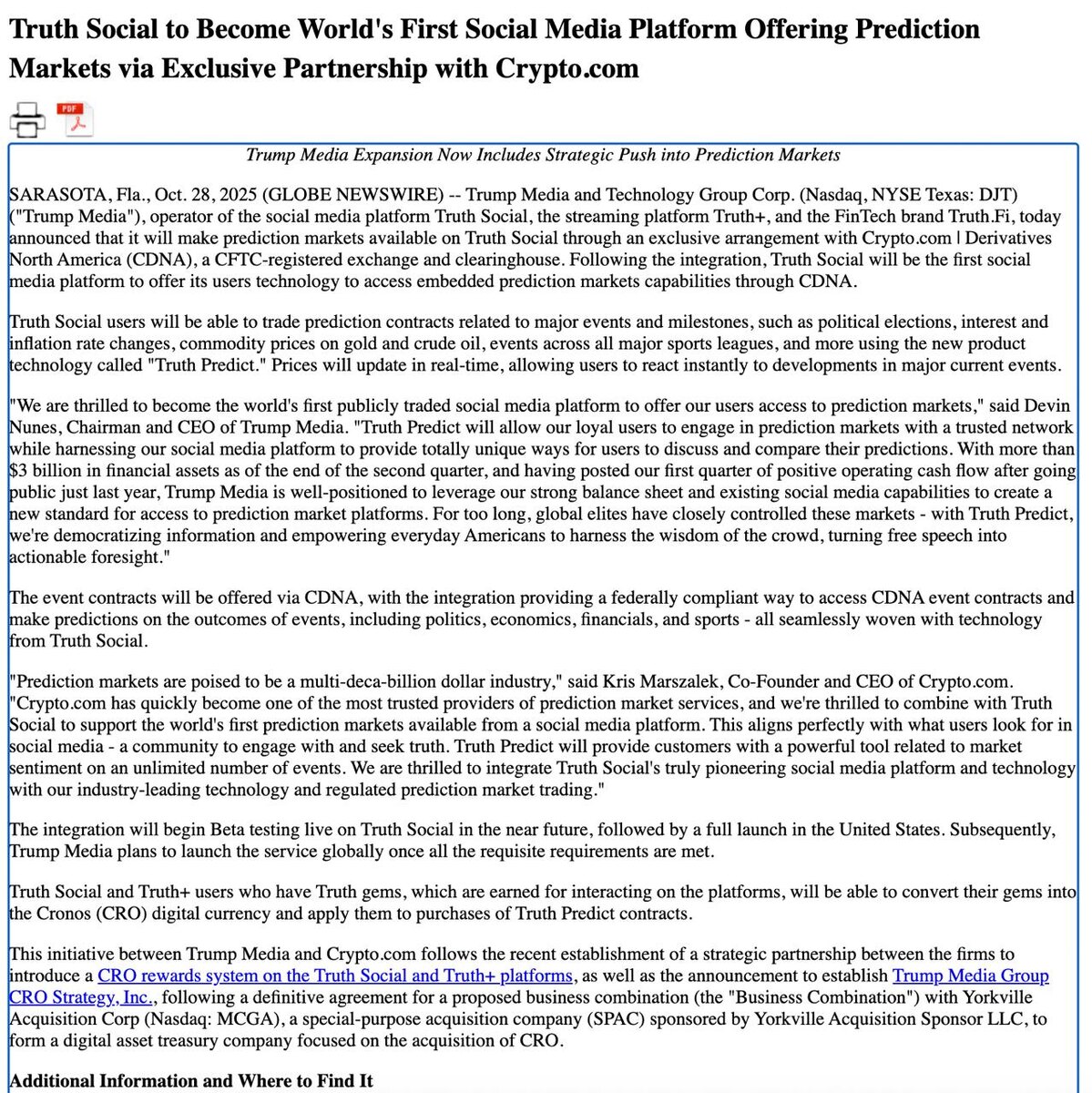 🤝 #CRO Компания Дональда Трампа Trump Media запустит рынок предсказаний «Truth Predict» в партнерстве с Crypto․com Crypto Headlines