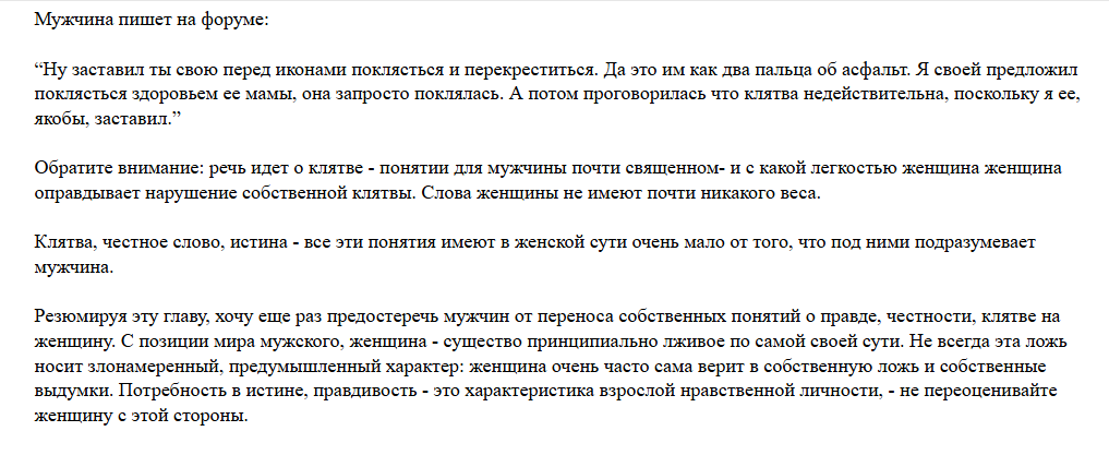 Единственно, что можно тут сказать в оправдание: заставлять женщин врать не современные мужчины придумали. Это тянется откуда-то из глубины веков. Видимо, с тех времен, когда женщина тотально зависела от мужчины, и он ее за человека не считал. Какая там правда, если тебя за не то слово прибьют или вышвырнут из дома, как котенка. А если взять относительно недавнее прошлое, то в СССР женщины точно врали. Передаю привет Плюшевому Мишке, как любителю фильма "Москва слезам не верит", и завершаю статью цитатой оттуда: