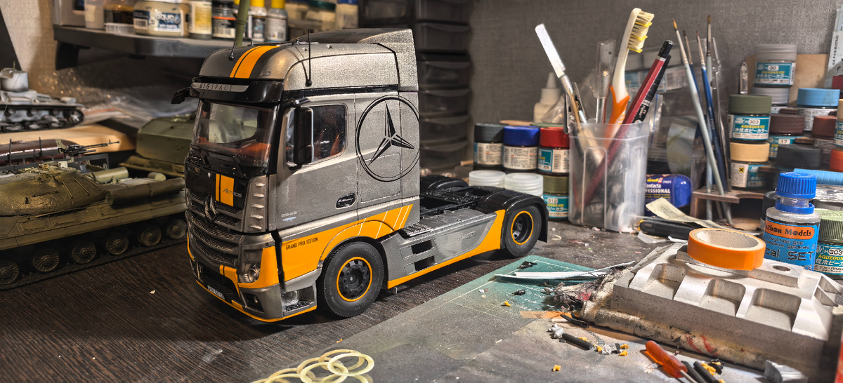 Всех приветствую! Собственно к вопросу о скорости сборки... Обзор на модель был 19 сентября если не ошибаюсь, а 21 сентября уже были первые штрихи. Так вот... Сегодня 28 октября... И следующая запись уже будет финалом этого проекта. Самое главное что я смог сделать это обода на дисках. Причем это декаль которая была в наборе. Просто из длинной сделать короткую разделив на 4 равные части. Одевать покрышки правда пришлось как на реальном шиномонтаже. Но тем не менее то что получилось мне нравится. Немного не до конца сел передний бампер, но это из за неудобства его установки, так как одев его уже кабину на место не установить. Осталось надеть клаксоны, оптику и по сути ВСЕ.