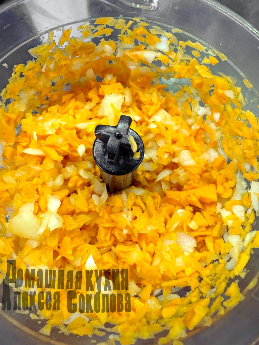 Лук и морковь – в блендер. И измельчить в импульсном режиме. То есть нажать на кнопку активации ноже и сразу отпустить. И так – до нужной степени измельчения. Просто пробивать все в чаще не следует – получится каша. А овощи следует просто измельчить, а не превратить в пюре.