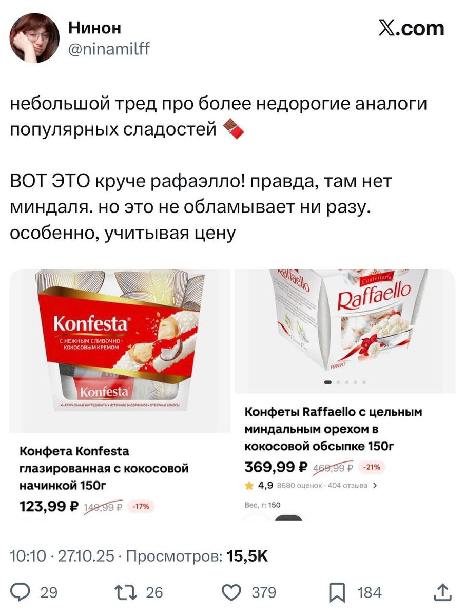 Раффаэлки в ДВА раза дешевле — твиттерские нашли замену культовым сладостям, которые не уступают по вкусу и не бьют по кошельку: 🔴 Raffaello — Konfesta, Адель, Luvetti, Nut&Go 🔴 Nutella — Nut Story 🔴 Picnic — Zebra 🔴 Kinder Joy — Lavita 🔴 Milka — Milk Story Найти всё это может в Пятёрочке, Перекрёстке и К&Б. Сохраняем, экономим и получаем те же ощущения 😋 CtrlAltDelights- подписаться