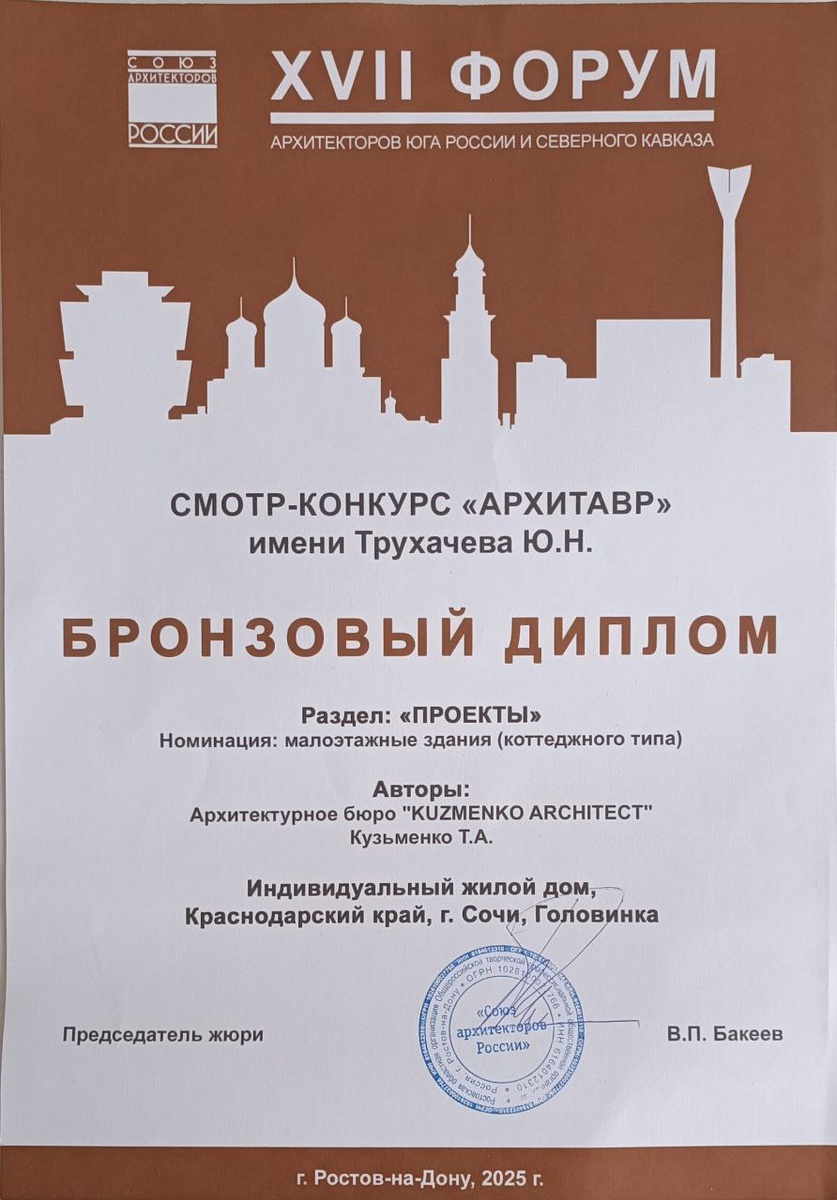 В ответ на пост А вот и сам диплом смотр-конкурса "Архитавр" за проект виллы в Головинке 🏆 Войти в лидеры конкурсного отбора — значит войти в число лучших архитектурных бюро региона. Для нас третье место в номинации это не просто награда, а подтверждение того, что архитектура с характером и смыслом находит отклик и у профессионального сообщества, и у заказчиков. Спасибо жюри, коллегам и всей команде KUZMENKO ARCHITECT — за идеи, энергию и веру в то, что современная архитектура может быть честной, живой и глубоко связанной с местом. #достижения