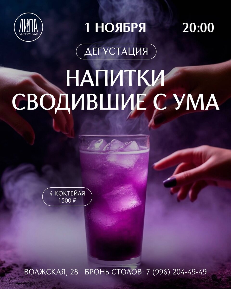 Есть коктейли, которые стали легендами не только из-за вкуса… Они вдохновляли поэтов, будоражили художников, рождали слухи и скандалы. Каждый — со своей историей сумасшествия, дерзости и страсти. В эту дегустацию мы собрали напитки, чей характер не забывают: они опьяняют не только градусом, но и мифами, которые их окружают. Стоимость: 1500₽ — 4 авторских коктейля + мини-закуски. Бронь столов: +79962044949