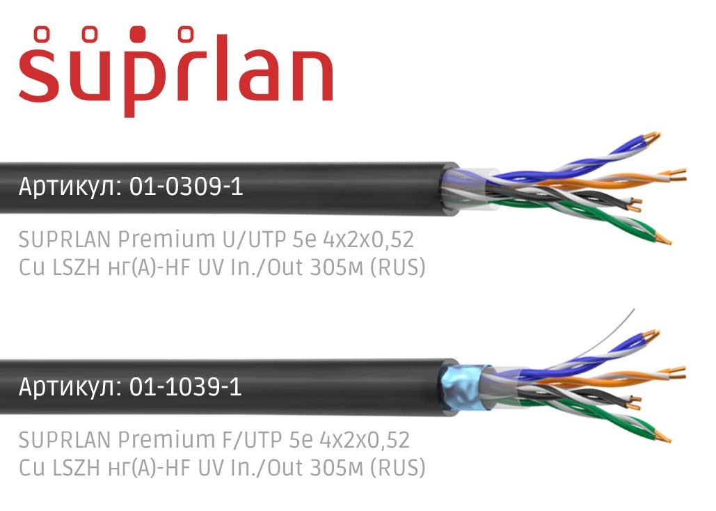 Новинки АССОРТИМЕНТА! Универсальные кабели LSZH нг(А)-HF UV In./Out 1. SUPRLAN Premium F/UTP 5e 4x2x0,52 Cu LSZH нг(А)-HF UV In./Out 305м (RUS) (арт.01-1039-1) 2.SUPRLAN Premium U/UTP 5e 4x2x0,52 Cu LSZH нг(А)-HF UV In./Out 305м (RUS) (арт.01-0309-1) Это LAN-кабели высшего класса, отличающиеся полным соответствием требованиям категории 5е по стандартам ISO/IEC11801, EN 50173, TIA/EIA568 и ГОСТ Р 54429-2011. Цвет – черный. Кабели предназначены для внешней и внутренней прокладки,и следующих задач: построение различных компьютерных информационных сетей, СКС, VoIP и IPTV, систем охраны и видеонаблюдения (в том числе сPoE+). Кабели изготавливаются в исполнении нг(А)-HF по «ГОСТ 31565-2012 Требования пожарной безопасности», что позволяет применять их в зданиях и сооружениях с массовым пребыванием людей, в том числе в многофункциональных высотных зданиях и зданиях-комплексах.