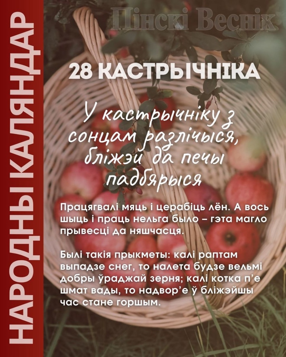 1️⃣1️⃣1️⃣1️⃣5️⃣1️⃣2️⃣ 1️⃣1️⃣1️⃣3️⃣1️⃣5️⃣1️⃣1️⃣ 📌28 кастрычніка ✏️Працягвалі мяць і церабіць лён. А вось шыць і праць нельга было – гэта магло прывесці да няшчасця. 🖋Былі такія прыкметы: калі раптам выпадзе снег, то налета будзе вельмі добры ўраджай зерня; калі котка п’е шмат вады, то надвор’е ў бліжэйшы час стане горшым. 📍📍@Пинский Вестник 📱ЮТУБ 📱САЙТ 📱ИНСТ 📱ВК 📱ОК 📱ФЕ 📱TikTok 📱Прислать новость