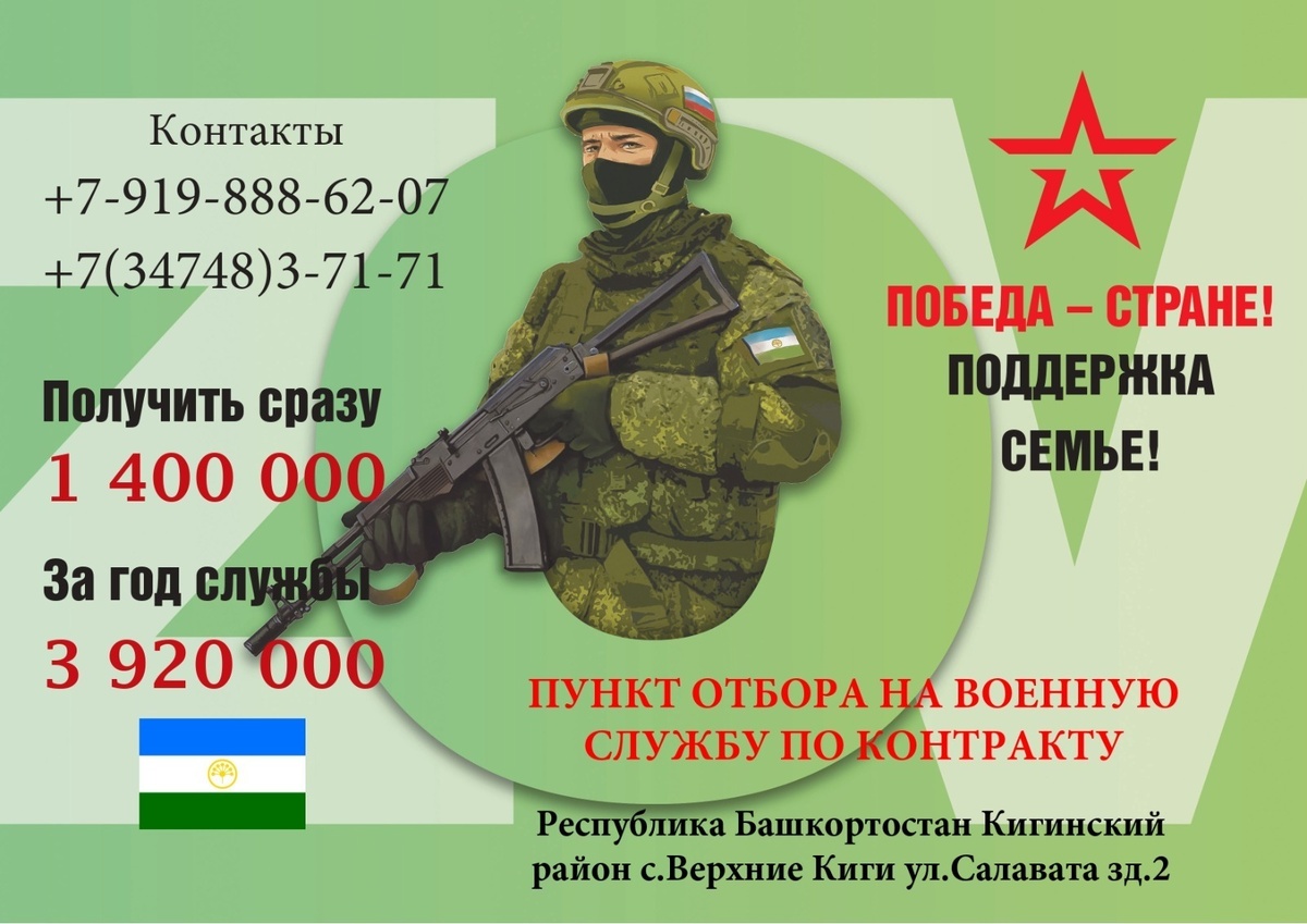 Каждый, кто подпишет контракт с Министерством обороны России, получит единовременную выплату 1 400 000 рублей, за год службы получит 3 920 000 рублей. Кроме того, в республике действует 54 региональные меры поддержки участников СВО и их семей. Они охватывают самые разные сферы жизни – образование, медпомощь, соцзащита, трудоустройство, решение бытовых проблем. Узнать подробную информацию о службе по контракту можно в военном комиссариате по Кигинскому и Белокатайскому районам по адресу: с.Верхние Киги, ул. Ибрагимова, д. 16, телефон: 8 347 48 3 07 10, 89198886207