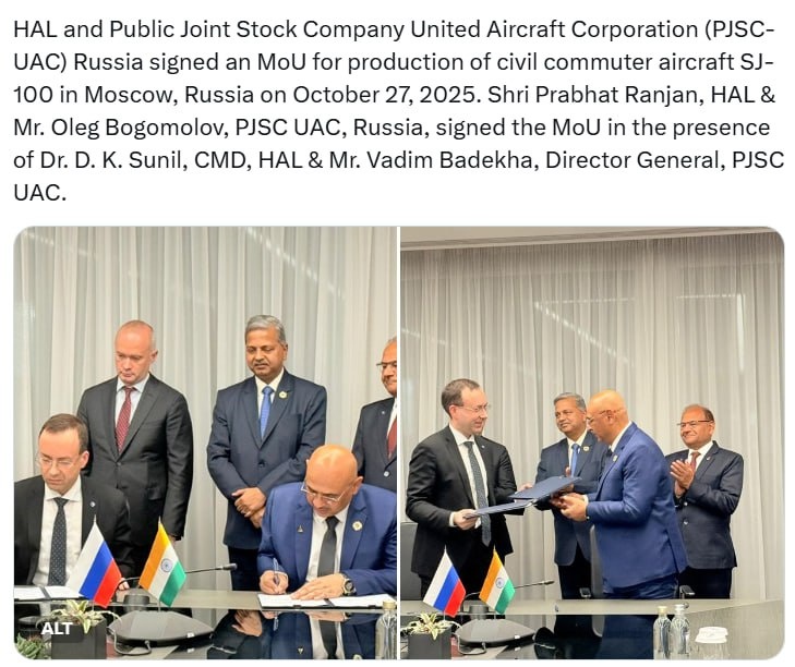О как. ОАК и индийская госкорпорация Hindustan Aeronautics Limited (HAL) подписали меморандум о производстве самолетов SJ-100. Подписание документа происходило в Москве. Договоренности предусматривают, что сборка будет полностью организована на территории Индии. Кроме того, в соответствии с меморандумом HAL получит права на создание SJ-100 для внутренних заказчиков. «Это также станет первым случаем полного производства пассажирского самолета в Индии. Последним таким проектом было производство HAL AVRO HS-748, которое началось в 1961 году и завершилось в 1988 году», - добавили в HAL. @tourdom